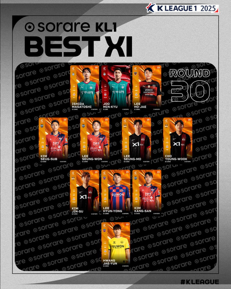23일 공개된 K리그1 2025 30라운드 베스트11. 사진=프로축구연맹 프로축구 K리그1 대전하나시티즌 공격수 주민규가 30라운드 최고의 선수로 꼽혔다.