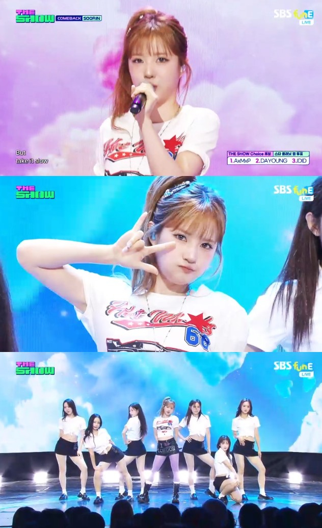 ‘더쇼’에서 수린은 스트리트 무드가 돋보이는 스타일링으로 등장, 발랄한 무드로 팬심을 정조준했다. 수린은 리드미컬한 ‘슈어 띵’ 사운드에 맞춰 부드러운 춤선을 보여주는가 하면, 안정적인 라이브로 보는 재미를 더했다.