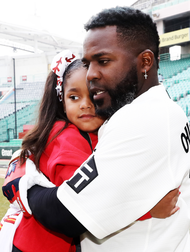 지난 3월에 열린 이른바 셋째 젠더리빌 행사에서 선수들의 축하를 받은 에레디아가 딸을 껴안고 있다. SSG 제공