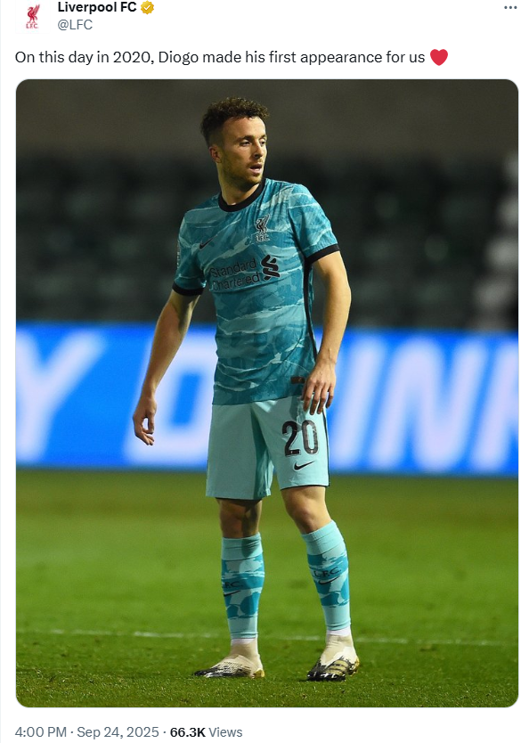 리버풀은 24일(한국시간) 구단 소셜미디어(SNS)를 통해 리버풀 유니폼을 입고 있는 조타의 사진을 게시했다. 해당 게시글엔 “지난 2020년 9월 24일, 조타가 우리 팀에서 첫 출전한 날”이라고 적었다. 지난 2020~21시즌을 앞두고 리버풀에 합류한 조타는 5년 전 이날 링컨 시티와의 잉글랜드 풋볼리그(EFL) 컵(카라바오컵) 3라운드서 소속팀 데뷔전을 소화한 바 있다.