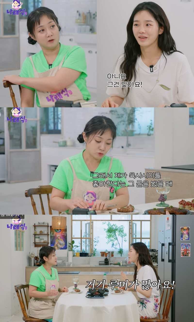 24일 유튜브 채널 ‘나래식’에는 넷플릭스 영화 사마귀 공개를 앞둔 박규영이 게스트로 출연했다. 이날 MC 박나래는 나무위키에서 본 정보를 토대로 박규영을 위해 묵은지 육회 김밥과 떡갈비, 육사시미 등을 준비했다.