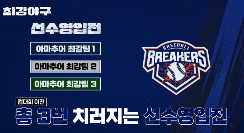사진=JTBC 기존에는 팀 ‘최강 몬스터즈’가 아마추어 팀들과 겨뤄 승률 7할을 달성해야 다음 시즌을 이어갈 수 있었다면 2025 시즌은 ‘최강 컵대회’를 개최하는 것으로 변화를 줬다. ‘최강 컵대회’는 브레이커스, 독립리그 최강팀, 대학리그 최강팀, 고교리그 최강팀 총 4팀이 예선리그를 치르고 상위팀끼리 우승팀을 가리는 토너먼트 형식으로, 브레이커스는 토너먼트에서 우승해야만 ‘최강’ 타이틀을 얻을 수 있는 것으로 변경됐다.
