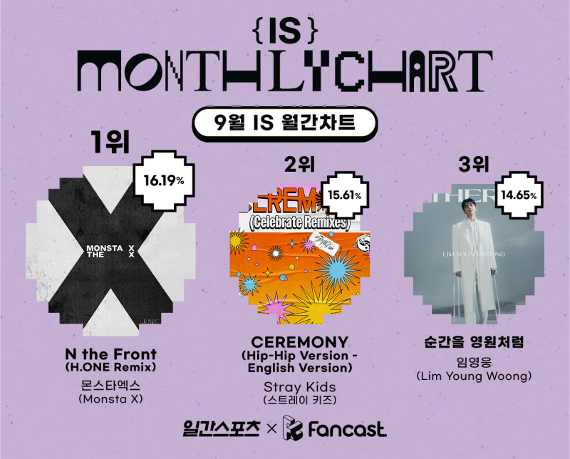 그룹 몬스타엑스의 ‘엔 더 프론트’가 9월 팬캐스트×일간스포츠 ‘IS 위클리 차트’ 종합 1위에 올랐다.