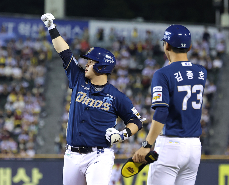 기뻐하는 이호준 감독 (서울=연합뉴스) 류영석 기자 = 1일 서울 잠실야구장에서 열린 프로야구 KBO리그 NC 다이노스와 LG 트윈스의 경기. 3회초 1사 3루 상황에서 NC 최원준이 1타점 적시타 때 이호준 감독이 홈인한 김주원을 격려하고 있다. 2025.10.1 ondol@yna.co.kr/2025-10-01 19:28:31/ <저작권자 ⓒ 1980-2025 ㈜연합뉴스. 무단 전재 재배포 금지, AI 학습 및 활용 금지> NC 다이노스가 LG 트윈스의 정규시즌 우승 도전을 가로막고 파죽의 8연승을 달렸다. 자력으로 5강행 진출 확정까지 1승만 남았다.
