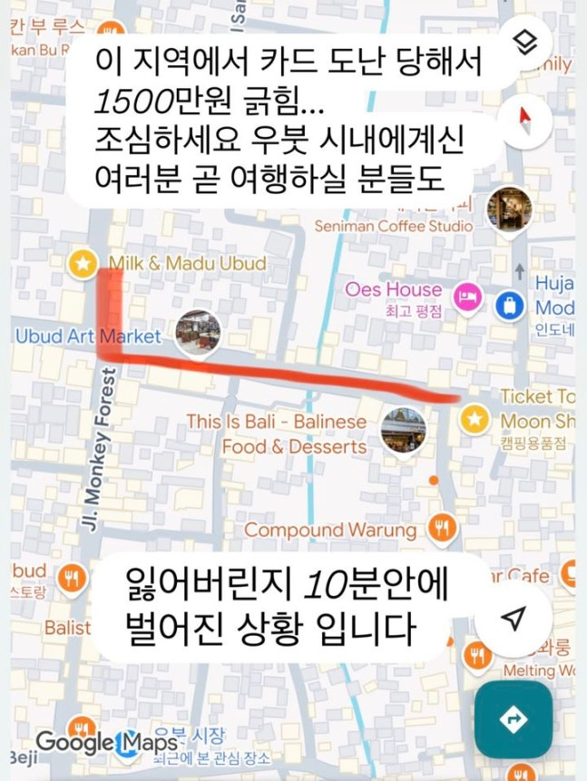 전혜빈은 1일 자신의 SNS에 “이 지역에서 카드 도난당해서 1500만 원 긁힘”이라며 피해 사실을 알렸다. 함께 올린 게시물에는 발리 우붓 지역의 지도 캡처 사진이 담겼다. 사진=전혜빈 SNS. 그는 “조심하세요. 우붓 시내에 계신 여러분, 곧 여행하실 분들도”라고 주의를 당부하면서 “잃어버린 지 10분 안에 벌어진 일”이라고 덧붙여 충격을 안겼다.
