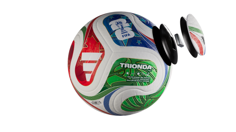 2026 북중미 월드컵 공인구 트리온다. 사진=아디다스코리아 모션 센서는 공의 움직임 데이터를 실시간으로 VAR 시스템에 전송해 선수 위치와 AI 분석을 결합함으로써 오프사이드와 같은 주요 판정을 한층 더 신속하고 정확하게 돕는다. 선수의 터치 상황까지 세밀하게 기록해 핸드볼 여부 등 판정 논란 상황에서도 도움을 준다.