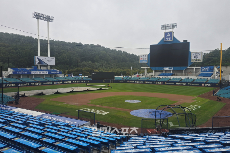 대구 삼성라이온즈파크에 방수포가 깔리고 있다. 오전부터 내리는 부슬비 때문이다. 와일드카드결정전(WC) 1차전 개시가 불투명하다.