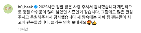 KT 간판타자 강백호는 지난 7일 추석을 맞이해 KT팬들에게 인사를 전했다. 그는 개인 소셜미디어(SNS)를 통해 "2025시즌 정말 많은 사랑 주셔서 감사했습니다. 개인적으로 정말 아쉬움이 많이 남았던 시즌인거 같습니다. 그럼에도 많은 관심 주시고 응원해 주셔서 감사했습니다. 제 맘속에는 저희 팀 팬분들이 최고에 팬분들입니다. 즐거운 연휴 보내세요"라는 글을 남겼다. KT가 정규시즌 6위로 가을야구를 할 수 없게된 상황에서 미안한 마음을 표현하기도 했다.