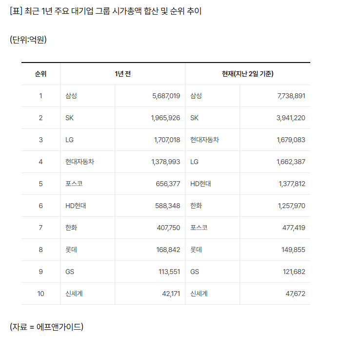 한화, 10대 그룹 중 1년 새 시총 3배 증가...그룹별 시총 순위도 요동