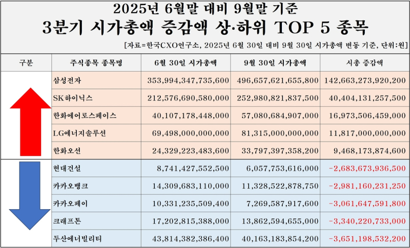 오일선 한국CXO연구소장은 "3분기 국내 주식시장은 제약과 조선, 이차전지, 전자·반도체 관련 종목이 강세를 보였다"며 "반면 건설, 정보통신, 유통 관련은 다수 기업의 시총이 하락했다"고 분석했다.