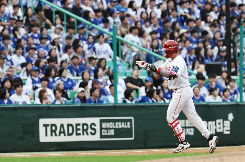9일 인천 SSG랜더스필드에서 열린 2025 프로야구 KBO리그 포스트시즌 준플레이오프 1차전 삼성 라이온즈와 SSG 랜더스의 경기. 7회말 1사 1루 SSG 고명준이 좌월 투런 홈런을 치고 그라운드를 돌고 있다. 2025.10.9 [연합뉴스]