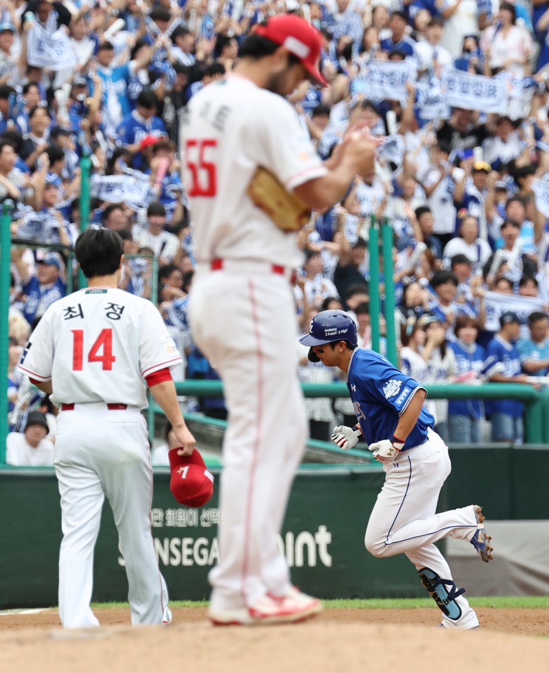 9일 인천 SSG랜더스필드에서 열린 2025 프로야구 KBO리그 포스트시즌 준플레이오프 1차전 삼성 라이온즈와 SSG 랜더스의 경기. 3회초 무사 1루 삼성 김영웅이 우월 투런 홈런을 치고 그라운드를 돌고 있다. 2025.10.9 [연합뉴스]