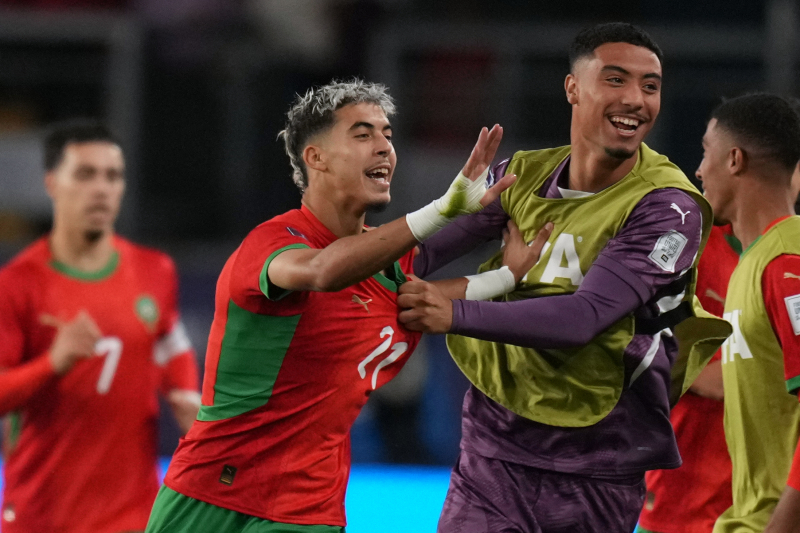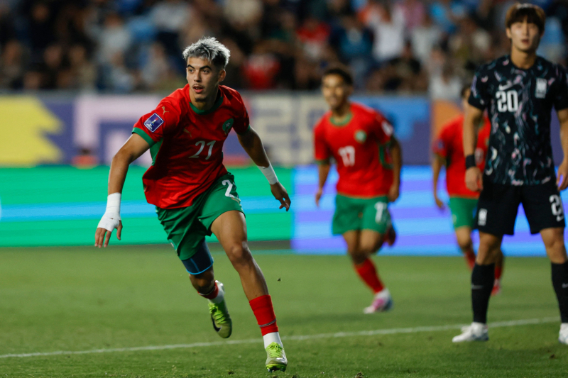모로코가 2025 U-20 월드컵 16강에서 한국에 선제골을 넣은 직후 모습. 사진=AP 연합뉴스 한국은 전반 43분 배현서가 왼쪽 측면을 원투 패스로 허물고 내준 컷백을 최병욱이 곧장 페널티 박스 바깥으로 연결했고, 이어진 정마호의 슈팅이 골문 위로 뜨며 아쉬움을 삼켰다. 힘이 잔뜩 들어간 슈팅이었다.