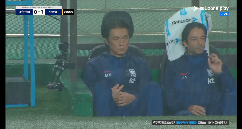 이날 브라질을 상대로는 홍명보호의 강점이 전혀 보이지 않은 듯했다. 대표팀은 전반 동안 세트피스 상황에서 나온 황인범의 슈팅 외엔 제대로 된 공격을 시도하지 못했다. 전반 초반 시도한 압박은 브라질의 개인 능력 앞에 무너졌다. 이에 대표팀은 수비진을 내렸으나, 전반 13분 단 한 번의 패스로 무너지며 이스테방에게 선제 실점했다. 이후 대표팀은 전반 41분 호드리구에게 추가 골을 실점한 채 전반을 마쳤다.