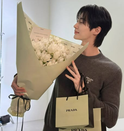 공개된 사진 속 변우석은 한 브랜드의 쇼핑백과 대형 꽃다발을 들고 환하게 미소 짓고 있다. 깔끔한 니트 차림에 자연스러운 헤어스타일로, 수수하면서도 세련된 분위기를 자아낸다.