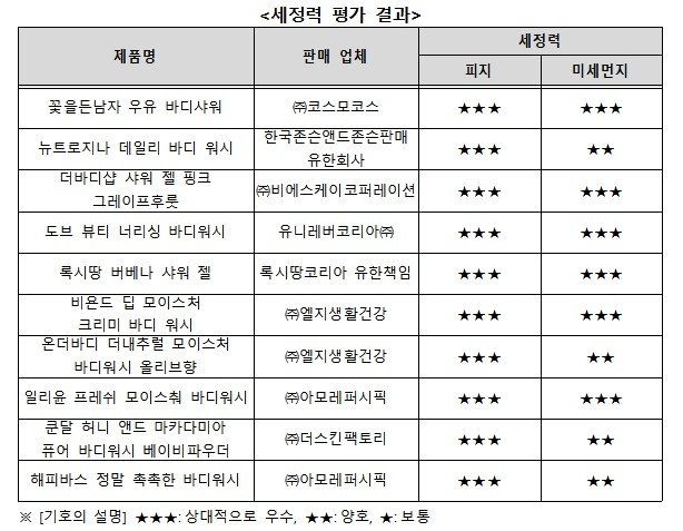 한국소비자원은 소비자 선호도가 높은 바디워시 10개 제품의 세정력과 사용감, 안전성, 환경성을 시험·평가한 결과를 14일 발표했다.