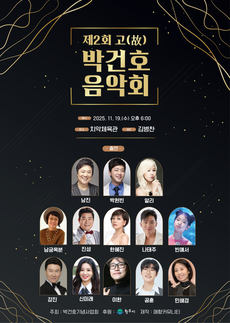 박건호 작사가는 1972년 작사가로 데뷔한 이래 조용필 ‘단발머리’ ‘모나리자’, 이용 ‘잊혀진 계절’, 나미 ‘빙글빙글’, 정수라 ‘아! 대한민국’, 민해경 ‘그대 모습은 장미’, 소방차 ‘그녀에게 전해주오’ 등 수많은 명곡을 탄생시켰다. 이번 음악회는 박건호 작사가의 고향인 원주에서 열려 그 의미를 더한다. 원주 시민에게는 무료 관람 기회를 제공하고, 저소득층·소외계층에게는 우선 관람권을 배정해 지역사회와 함께하는 문화 나눔의 장으로 자리매김했다.