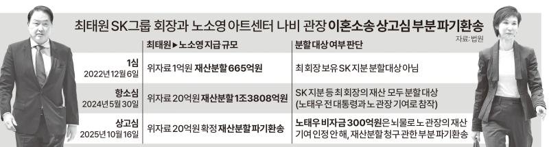 ‘세기의 소송’으로 불리는 최태원 SK그룹 회장과 노소영 아트센터 나비 관장의 이혼 소송 결말이 다시 원점으로 돌아갔다. 2심 판결을 깨고 1조4000억원에 육박하는 재산분할과 관련해 다시 판단하라며 서울고법으로 돌려보냈다.