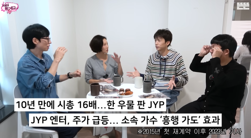 사진=유튜브 채널 ‘뜬뜬’ 이어 “첫 재계약 당시 지분이나 현금 중 하나를 선택할 수 있었는데 그때는 회사가 어떻게 될지 모르니까 현금을 택했다”며 “그땐 몰랐는데 돌아보니 돌아버리겠다”고 말해 웃음을 자아냈다. 장우영이 재계약을 했던 2015년에 비해 2023년 기준 JYP의 시가총액은 10년 만에 약 16배가량 폭등한 것으로 알려졌다.