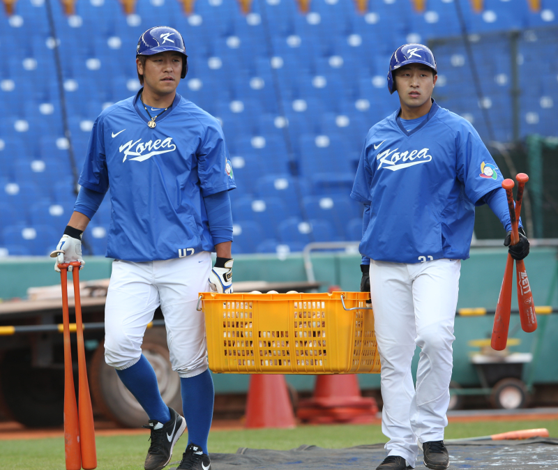 2013년 WBC 대표팀에서 함께 공을 나르고 있는 강민호(왼쪽)과 손아섭. 한국시리즈 우승 길목에서 경쟁자로 만났다. IS포토 '무관의 제왕' 강민호(40·삼성 라이온즈)와 손아섭(37·롯데 자이언츠)이 한국시리즈(KS) 길목에서 만난다.