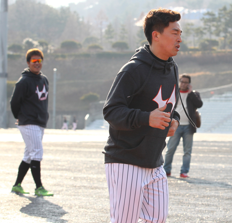 2014.01.06 부산=김민규 기자 <롯데자이언츠 체력테스트> 6일 시무식을 마친 롯데자이언츠선수들이 오후 부산 아시아드 보조경기장에서 체력테스트를 가졌다. 손아섭 1000m 달리기를 힘겹게 뛰는 동안 뒤에서 강민호가 웃으며 바라보고 있다.