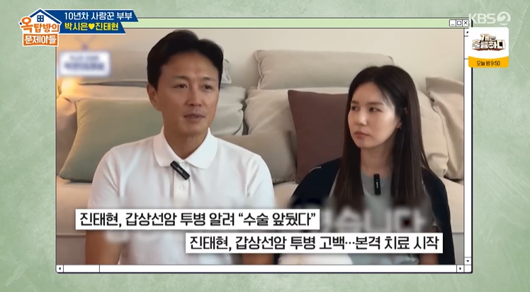 16일 오후 방송된 KBS2 예능 ‘옥탑방의 문제아들’에는 갑상선암을 3개월 만에 극복한 배우 진태현과 그의 아내 배우 박시은이 출연했다.