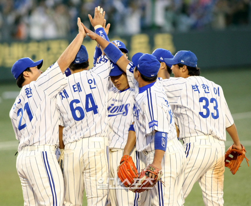 2008년 준플레이오프에서 롯데 자이언츠를 꺾고 업셋에 성공한 삼성. IS 포토