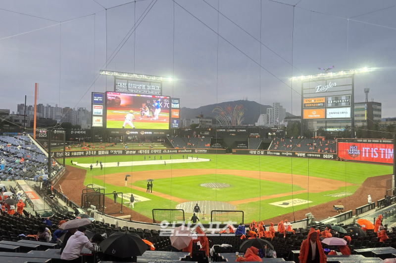 플레이오프(PO·5전3선승제) 1차전을 앞둔 대전 한화생명볼파크에 소나기가 쏟아지고 있다. 대형 방수포도 깔렸다.