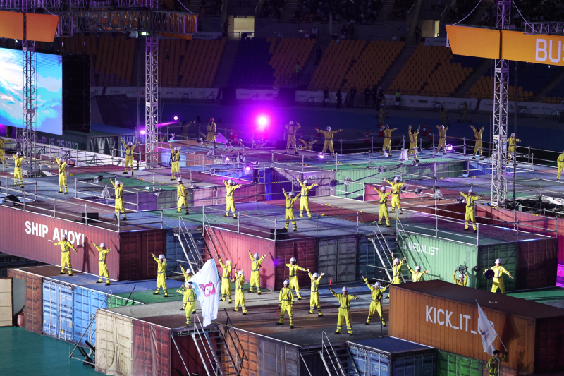 제106회 전국체육대회 개회식 (부산=연합뉴스) 강선배 기자 = 17일 오후 부산 연제구 부산아시아드주경기장에서 열린 '제106회 전국체육대회' 개회식에서 식전 공연이 펼쳐지고 있다. 이번 전국체전은 재외동포 등 전국 17개 시도에서 총 3만여 명의 선수단이 참가해 50개 종목에서 열전을 펼친다. 2025.10.17 sbkang@yna.co.kr/2025-10-17 18:16:47/ <저작권자 ⓒ 1980-2025 ㈜연합뉴스. 무단 전재 재배포 금지, AI 학습 및 활용 금지> 부산항 컨테이너 터미널을 실제 옮겨온 듯한 초대형 무대가 부산아시아드주경기장 그라운드 위에 자리했다. 상선을 맞이할 준비로 분주한 부산항 터미널의 에너지를 표현한 공연이 컨테이너 무대에서 펼쳐졌다.