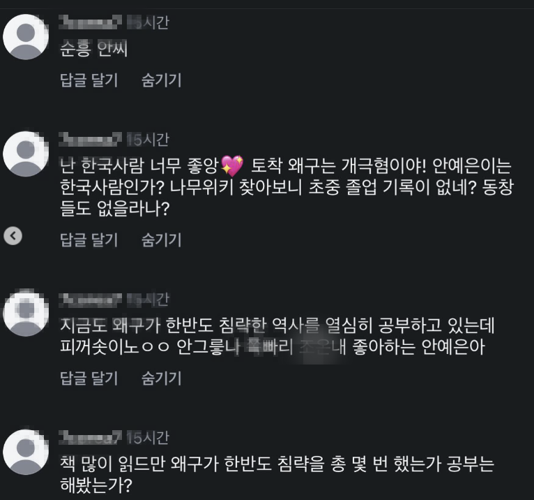 안예은이 함께 게시한 댓글 캡처에는 “일본을 너무 좋아하는 안예은의 정체성이 궁금해 위키에 쳐봤다. 초, 중 기록이 없네 생애기록도 없네” “한국인 맞냐” “토착 왜구” 등 비하 발언이 담긴 악플이 지속적으로 여러 건 담겨 있다.