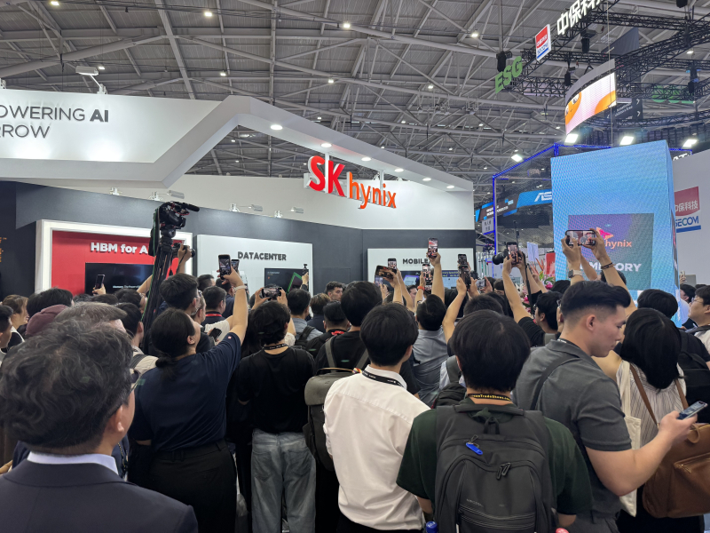 '컴퓨텍스 2025'의 SK하이닉스 부스에 몰린 방문객들. 연합뉴스 “연봉을 성과급으로 한 번 더 받을 수 있다는데 선호할 수밖에 없죠.”