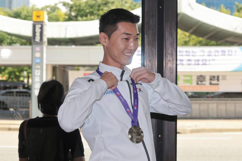 미소지으며 귀국한 우상혁 (서울=연합뉴스) 김인철 기자 = 2025 도쿄 세계육상선수권대회 남자 높이뛰기 결선에서 은메달을 획득한 우상혁이 18일 서울 강서구 김포국제공항으로 귀국하며 은메달을 걸어 보이고 있다. 2025.9.18 yatoya@yna.co.kr/2025-09-18 15:33:59/ <저작권자 ⓒ 1980-2025 ㈜연합뉴스. 무단 전재 재배포 금지, AI 학습 및 활용 금지>