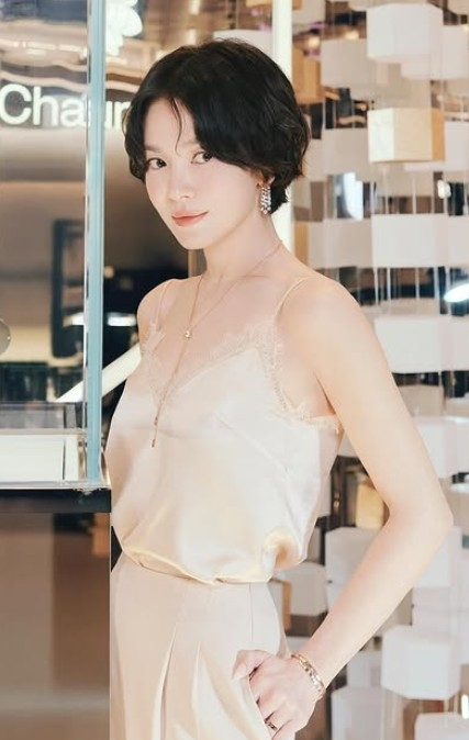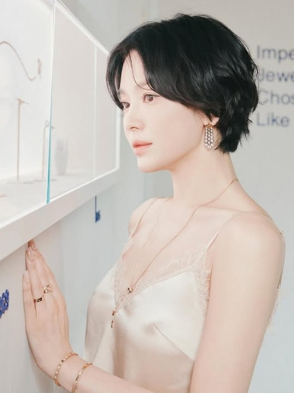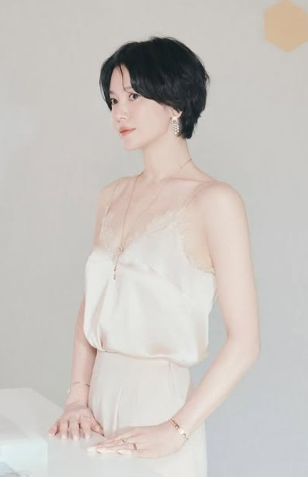 공개된 사진 속 송혜교는 깔끔한 블랙 숏컷 헤어스타일과 베이지색 레이스 슬립룩으로 우아하면서도 고혹적인 분위기를 연출했다. 그는 화려한 드롭 이어링과 목걸이, 팔찌 등을 착용한 채 카메라를 응시하고 있다.