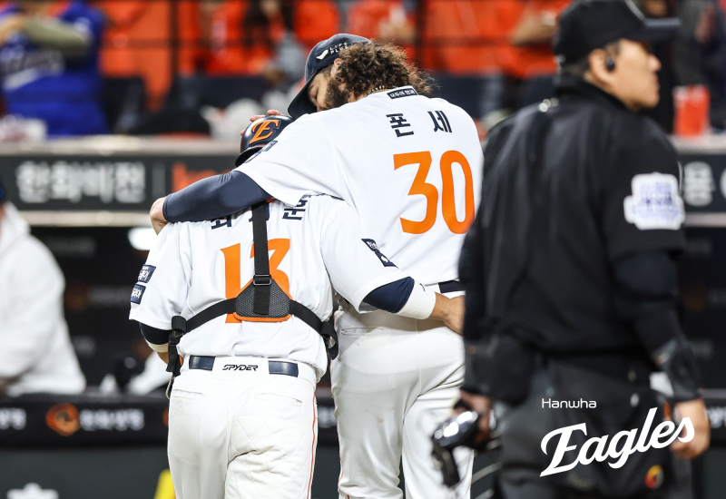 폰세가 24일 플레이오프 5차전에서 포수 최재훈과 기쁨을 나누고 있다. 에이스의 귀환. 정규시즌 투수 4관왕 코디 폰세(31)가 한화 이글스의 한국시리즈(KS) 진출이 걸린 경기에서 쾌투했다.