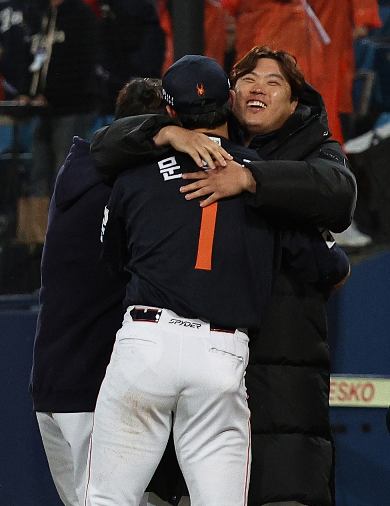 문동주 부진이 체력 여파인지. 지친 것보다도 초반에 몸이 덜 풀린 것 같다. 다음 경기 잘 준비하겠다. 노시환 수비에서 아쉬운 모습 다 막아줬으면 하지만 젊은 친구고, KS를 처음하는 게 아닌가. 내일은 더 좋은 플레이가 나올 거라고 생각한다. 류현진 향한 기대감은? 오늘과는 다르게 볼넷을 적게 만드는 게 중요하다. 오늘 볼넷 다음에 점수를 많이 줬다. 안타 수는 똑같았지만, LG가 (집중력이) 더 좋았다. 내일 한화가 반대가 될 수 있도록 잘 준비하겠다. 21일 대구 삼성라이온즈파크에서 열린 2025 프로야구 KBO리그 포스트시즌 플레이오프 3차전 한화 이글스와 삼성 라이온즈의 경기. 경기 종료 후 한화 류현진이 문동주를 안아주고 있다. 2025.10.21 [연합뉴스]