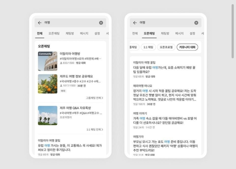 검색 탭에서는 키워드로 이모티콘을 찾을 수 있다. ‘ㅠㅠ’나 ‘또르르’를 입력하면 눈물을 흘리는 이모티콘이 나타난다. 중앙의 이모티콘 탭은 최근 사용하거나 즐겨찾기한 이모티콘을 보여준다. 이 외에도 오픈채팅 커뮤니티에서는 키워드로 대화를 검색할 수 있게 됐다.