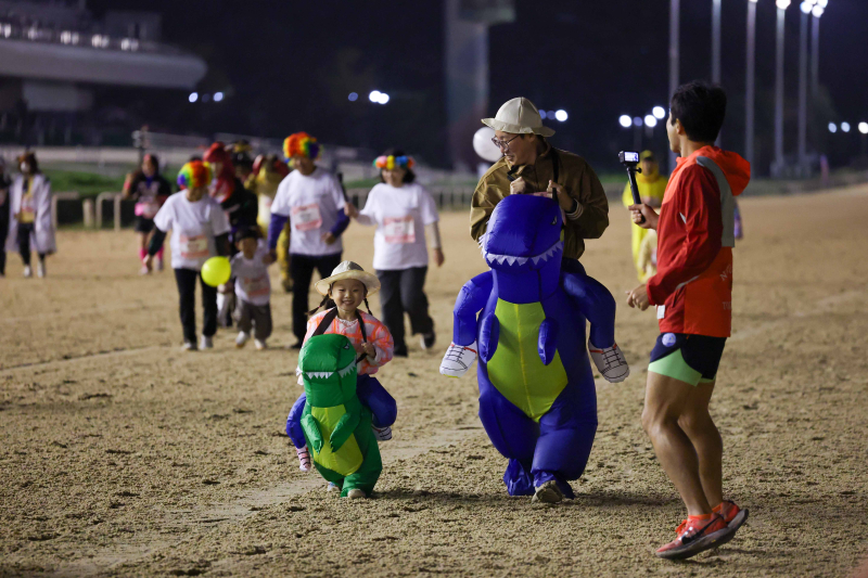 지난 18일 경주가 끝난 렛츠런파크 서울 경주로에 공룡 코스튬을 한 가족이 등장했다. 바로 '제4회 렛츠런파크 경주로 마라톤'에 참여하기 위해서였다. 이 외에도 경주마 육성게임 '우마무스메 프리티더비'에 등장하는 말 코스튬을 비롯해 케데헌, 슈퍼맨 등 다양한 코스튬으로 개성을 뽐낸 참가자들이 다수 눈에 띄었다.