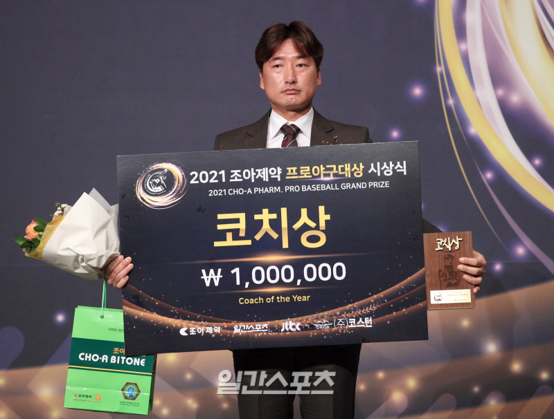 "‘2021 조아제약 프로야구대상 시상식'이 8일 서울 중구 더플라자 서울 그랜드볼룸에서 열렸다. 두산 정재훈코치가 코치상을 수상하고있다. 일간스포츠 특별취재반/ 2021.12.08/"