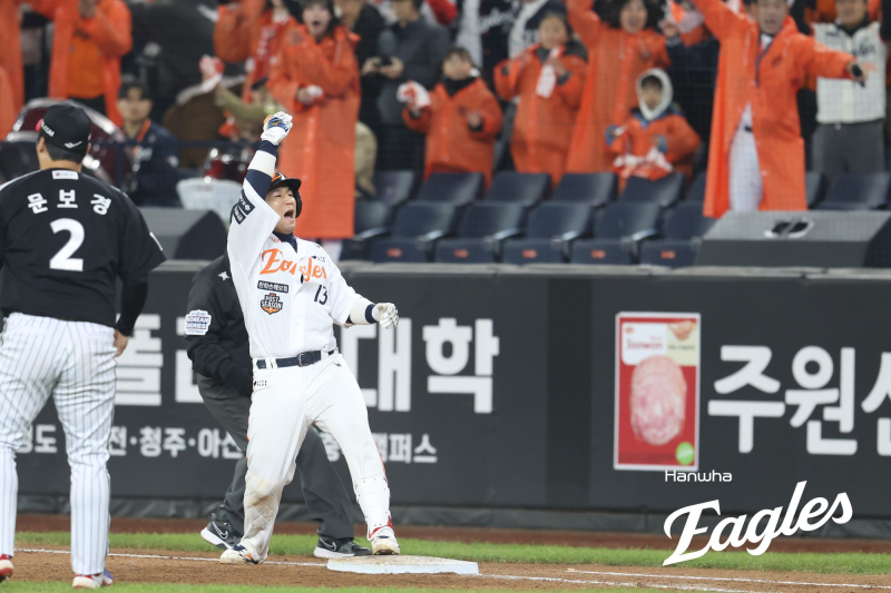 한화는 2차전에서 극적인 승리를 거뒀다. 에이스 코디 폰세가 6회까지 2점만 내주며 호투했지만, 타선이 LG 선발 손주영을 공략하지 못해 8회 초까지 1-3으로 끌려갔다. 하지만 8회 말 공격에서 선두 타자 김태연이 빗맞은 행운의 안타로 2루를 밟고, 손아섭이 우전 안타를 치며 동점 주자로 나선 뒤 올가을 가장 타격감이 좋은 문현빈이 LG 바뀐 투수이자 클로저 유영찬을 상대로 좌중간 안타를 치며 1점을 추격했다. 이후 한화는 채은성이 볼넷을 얻어내 만든 2사 만루에서 대타 황영묵까지 볼넷을 골라내며 밀어내기로 3-3 동점을 만들었다. 이어 나선 심우준이 왼쪽 빗맞은 타구를 만들어 주자 2명을 불러들여 5-3으로 전세를 뒤집었다.