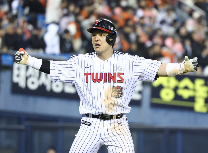 (대전=연합뉴스) 김준범 기자 = 30일 대전한화생명볼파크에서 열린 2025 프로야구 KBO리그 포스트시즌 한국시리즈 4차전 LG 트윈스와 한화 이글스의 경기. 9회초 무사 2루 때 LG 박동원이 2점 홈런을 쳐낸 뒤 2루 베이스를 돌고 있다. 2025.10.30 psykims@yna.co.kr/2025-10-30 21:36:02/ <저작권자 ⓒ 1980-2025 ㈜연합뉴스. 무단 전재 재배포 금지, AI 학습 및 활용 금지> "오늘 같은 경기가 또 있을까요?"