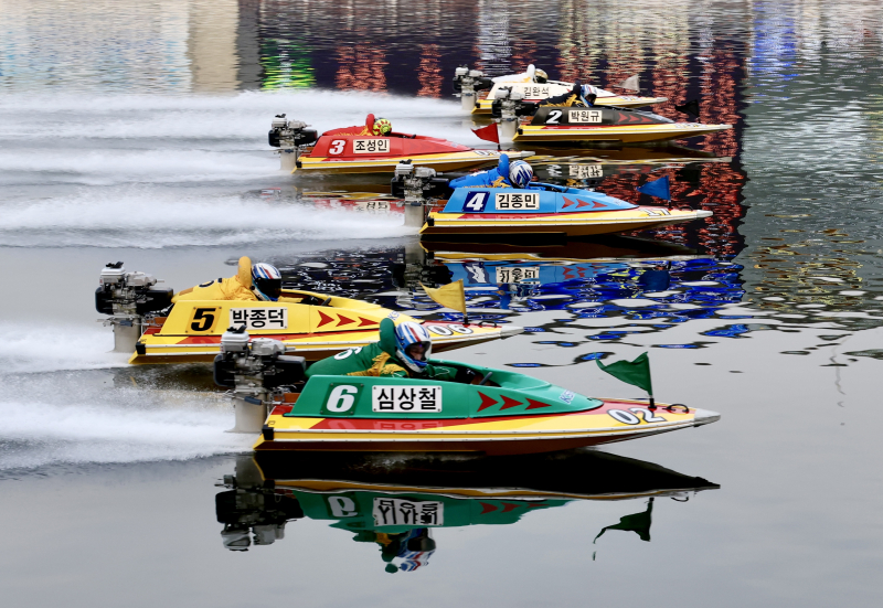 제23회 쿠리하라배 특별경정 결승전에 출전한 선수들이 플라잉 스타트로 경주를 시작하고 있다. 국민체육진흥공단