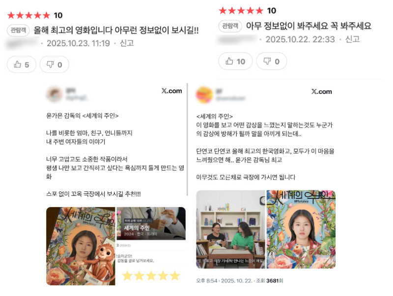 개봉 전 시사회에서 배부된 윤 감독의 자필 편지도 영화에 궁금증을 더했다. 윤 감독은 직접 “중심인물과 줄거리에 대한 핵심적인 정보 없이 관람할 때 더 큰 영화적 재미를 느끼고 새로운 이해가 가능한 이야기 구조로 진행된다”며 주인이 과거에 겪은 일을 리뷰로 언급하지 않길 당부했다.