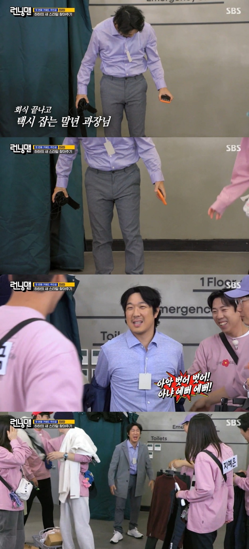 멤버들은 하하를 데리고 한 옷 가게를 찾았다. “회식 끝나고 택시 잡는 말년 과장님 같다”는 유재석의 평에 모두가 폭소했고, 김종국은 “경조사 마이까지 추가하자”며 장난을 쳤다. 하하는 어쩔 수 없이 꾸역꾸역 옷을 갈아입으며 괴로워했다.