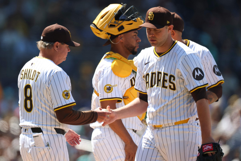 SAN DIEGO, CALIFORNIA - APRIL 30: Manager Mike Shildt #8 of the San Diego Padres removes Michael King #34 during a pitching change in the sixth inning against the San Francisco Giants at Petco Park on April 30, 2025 in San Diego, California. Brandon Sloter/Getty Images/AFP (Photo by Brandon Sloter / GETTY IMAGES NORTH AMERICA / Getty Images via AFP)/2025-05-01 07:11:04/ <저작권자 ⓒ 1980-2025 ㈜연합뉴스. 무단 전재 재배포 금지, AI 학습 및 활용 금지>