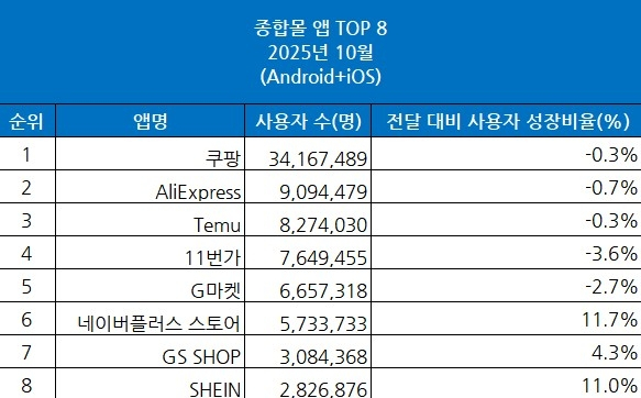 알리익스프레스와 테무의 월간 이용자 수는 각각 909만4479명, 827만4천30명으로 0.7%, 0.3% 감소했다.
