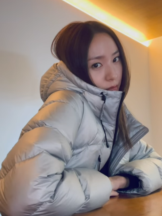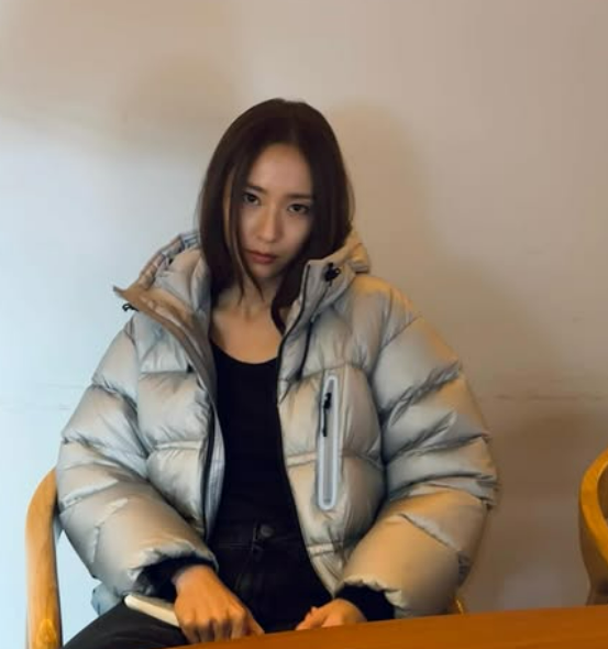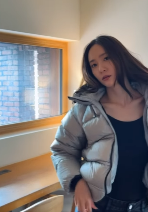 첫 번째 컷에서는 블랙 상의와 진 위에 볼륨감 있는 실버 패딩을 걸치고, 벽에 기대 선 채로 카메라를 응시한다. 따뜻한 조명 아래에서도 차가운 분위기를 잃지 않아, 정수정 특유의 도회적인 이미지가 한층 부각됐다. 사진제공=크리스탈 SNS