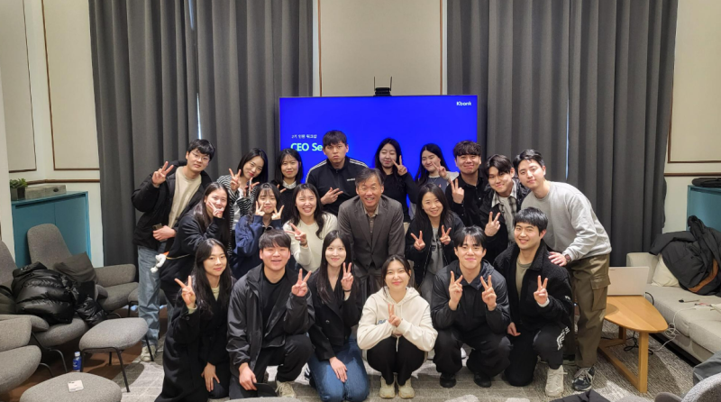 케이뱅크 인턴 워크숍에서 최우형(가운데) 대표와 함께 기념 사진을 찍고 있는 정규직 전환 인턴들. 케이뱅크 제공