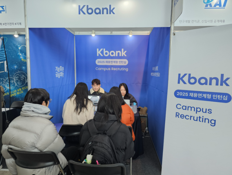 케이뱅크의 대학교 채용박람회 부스 모습. 케이뱅크 제공 두 자릿수의 인턴을 뽑는데 5000명 이상이 몰렸다는 설명이다. 이중 정규직으로 1~2명이 뽑히는 게 아니라 정규직 전환율이 30%가 넘는 것으로 알려졌다. 정규직 전환이 ‘바늘구멍’이 아닌 셈이다. 이에 인턴십 경쟁률이 최대 300대 1까지 치솟은 것으로 추정되고 있다.