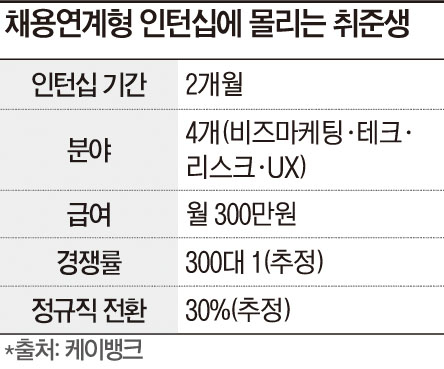 케이뱅크 관계자는 “다른 기업의 인턴십과 다르게 1~2명만 정규직으로 뽑는 게 아니라 상당한 숫자의 정규직 인원을 뽑기 때문에 취준생들의 관심이 높은 것으로 알고 있다”고 말했다.