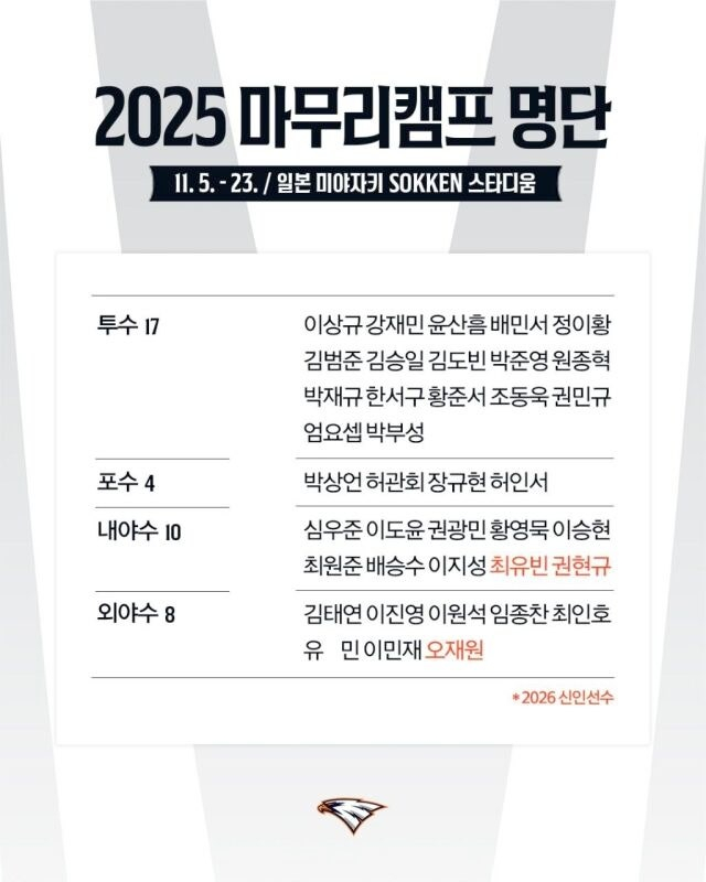 올해 1군에서 활약한 선수 가운데 황준서, 이도윤, 황영묵, 김태연, 최인호 등이 이번 마무리 캠프에서 담금질을 한다. 신인으로는 외야수 오재원(1라운드), 내야수 최유빈(4라운드)·권현규(5라운드가 마무리 캠프 명단에 이름을 올렸다.